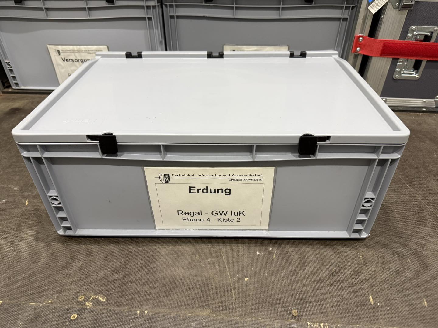 Auf unserem GW IuK im Kofferaufbau an der Stirnseite ist ein Regal montiert auf dem eine Beladung mitgeführt wird.