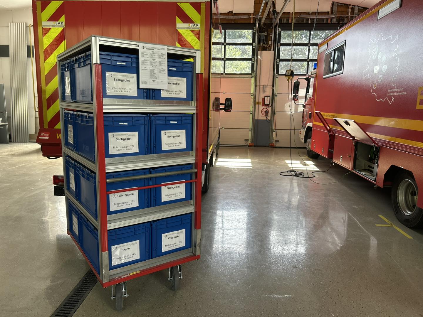 Auf unserm GW IuK ist immer der Rollcontainer TEL verlastet. Auf diesem führen wir alle Arbeitsmaterialen zum einrichten einer Technischen Einsatzleitung mit, in zwölf Kisten ist vom Bleistift bis zum Notebook alles sicher verstaut.
